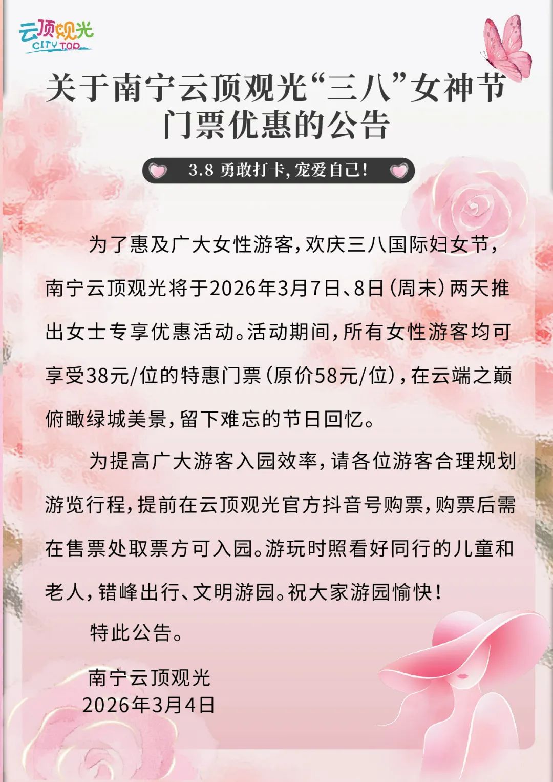 开云体育,开云体育官方网站,开云体育APP下载3月4日,南宁市云顶观光发布公告,将于3月7日、8日(周末)两天推出女士专享优惠活动。活动当天,所有女性游客均可享受38元特惠门票(原价58元),在云端之巅领略绿城风采。