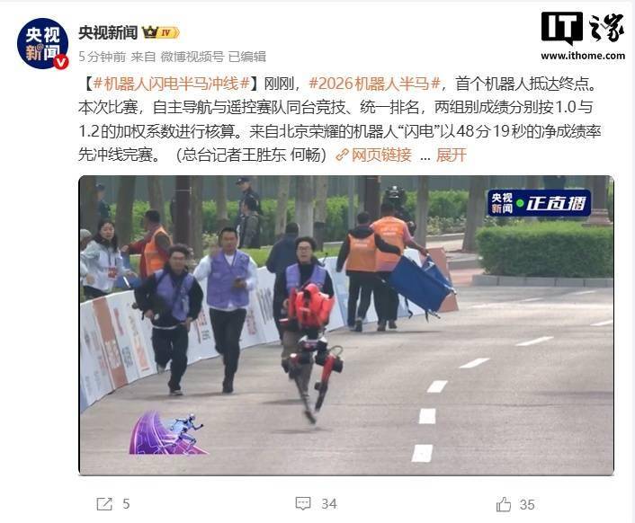 首届北京亦庄机器人半程马拉松 4 月 19 日举行,105 支人形机器人队伍与真人同场竞技。荣耀“闪电”以 48 分 19 秒的净成绩率先冲线,成为赛事冠军。比赛规则为自主导航与遥控队伍统一排名,但成绩按不同加权系数核算。