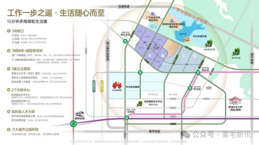 高精尖圈层聚落:毗邻华为总部基地,周边吸引康冠、神舟等众多知名企业,培育逾600家高新技术企业。作为全球第三大万亿级电子信息产业集群承载区,坂田汇聚了庞大的高素质精英人群,区域发展前景广阔。