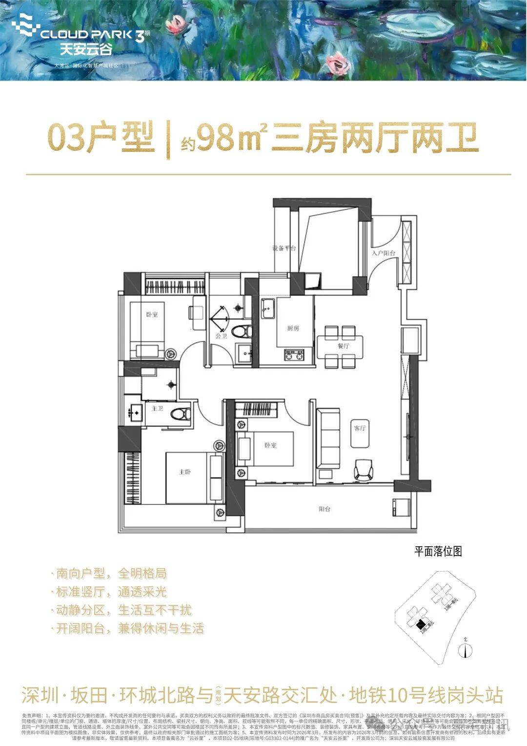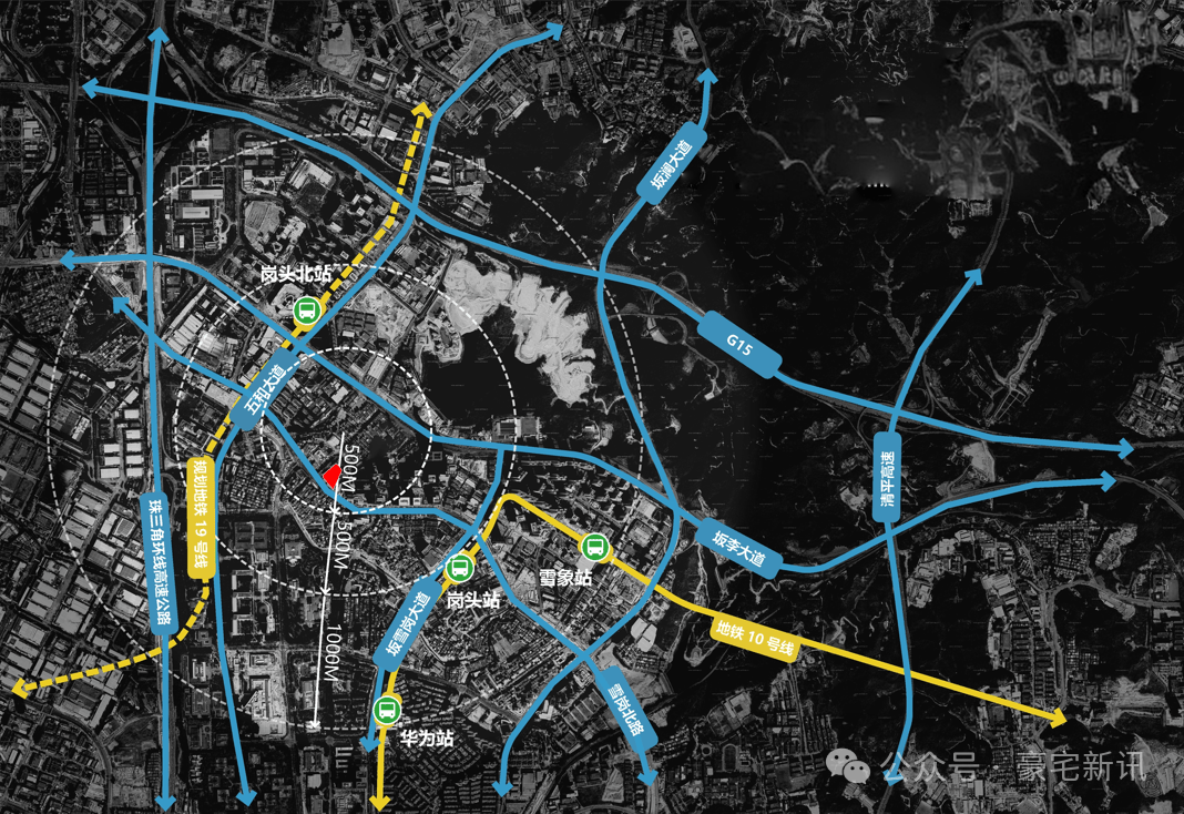 陆路交通:项目紧临坂雪岗大道、五和大道、布龙路等主干道环绕,快速接驳南坪快速、水官高速、机荷高速,20分钟直达深圳北站,40分钟可达宝安国际机场,同时可通过周边城际线路快速连通东莞、广州,实现湾区1小时生活圈。