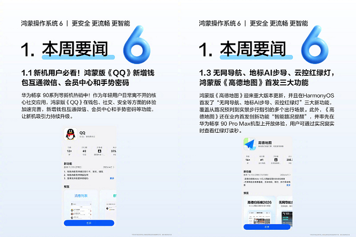 除微信外,还有更多头部应用完成鸿蒙生态的深度适配,如鸿蒙版QQ新增在钱包、社交、安全等方面的体验加速完善,新增钱包互通微信、会员中心和手势密码等功能;鸿蒙版高德地图首发了“无网导航、地标AI步导、云控红绿灯”三大新功能,覆盖从路况预判到实景步行指引的多个出行场景;鸿蒙版抖音拍摄支持文字模式,作品权限设置补齐,热点讨论支持发评等等。