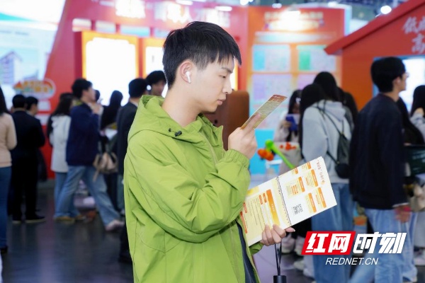 青年人才在长沙展区前认真阅读人才政策手册,详细了解住房补贴、落户支持、创业扶持等专属福利。