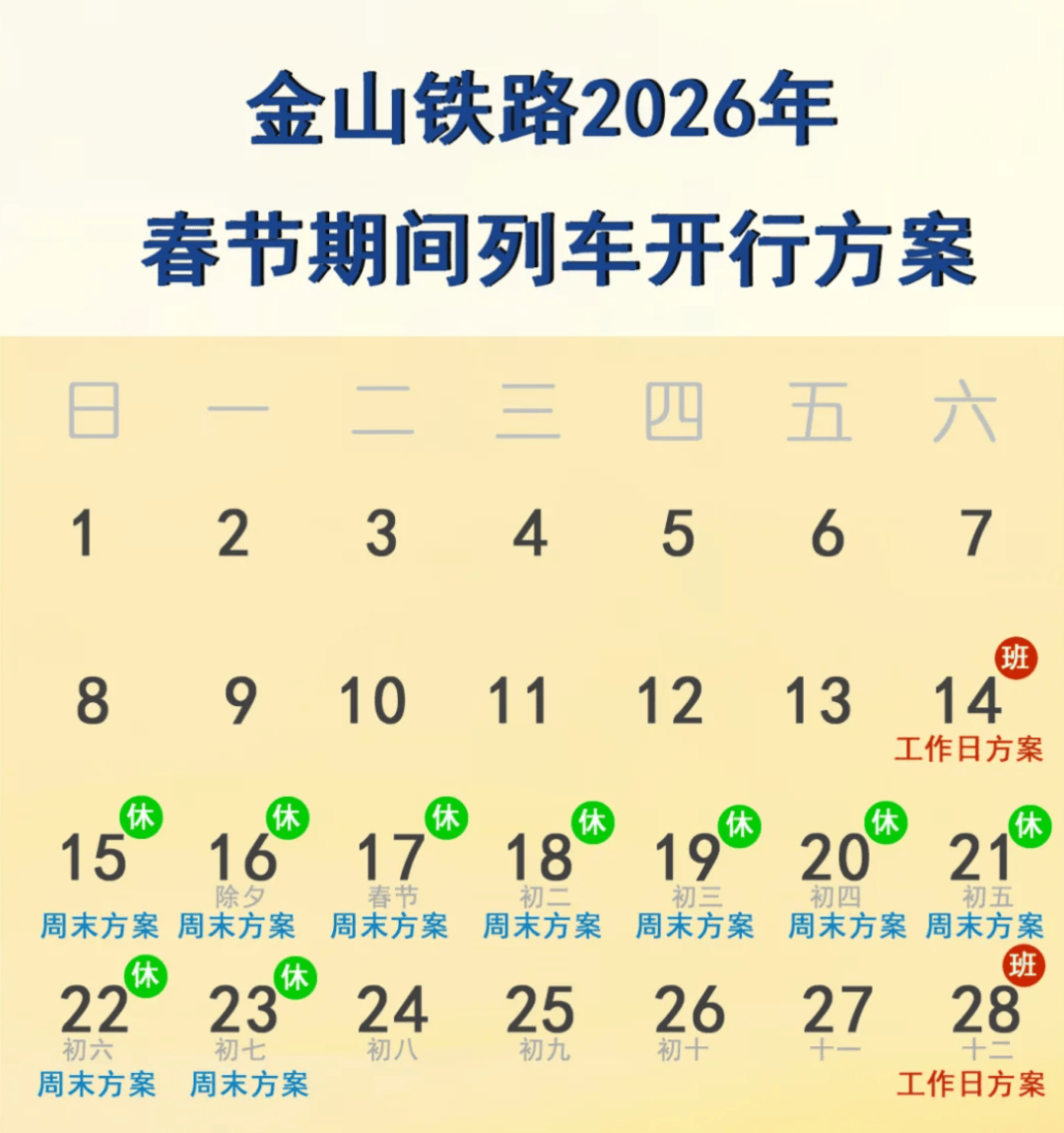 金山铁路介绍,根据相关通知安排,金山铁路2026年春节期间列车开行方案如下:2月14日(周六)、2月28日(周六)实行工作日方案;2月15日至2月23日实行周末方案。