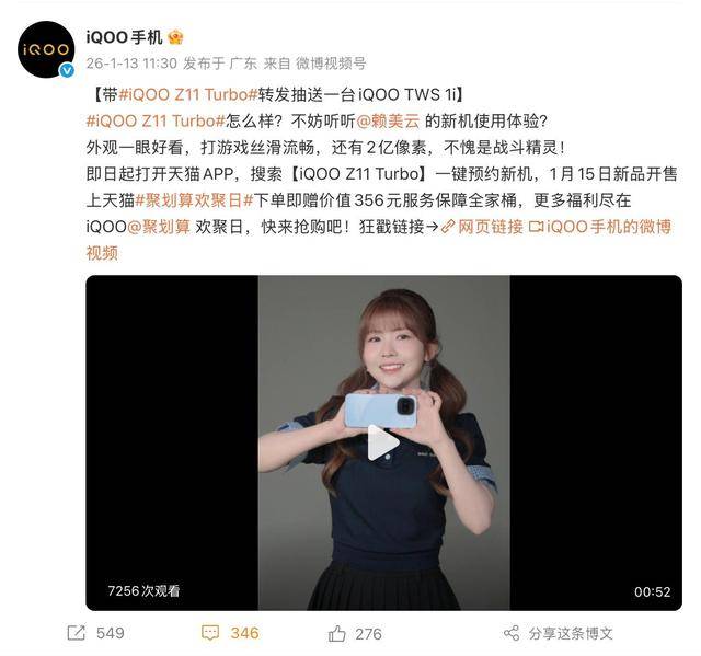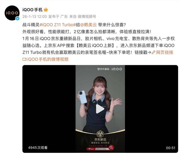 今晚(1月13日)19:00,iQOO Z11 Turbo新品体验官赖美云将如约做客iQOO直播间,与网友粉丝一起“云逛展”。即日起打开天猫APP搜索【iQOO Z11 Turbo】、打开京东APP搜索【赖美云iQOO上新】进入商品活动页面,即有机会赢取购机保障、新品周边及赖美云亲笔签名等丰富礼遇。
