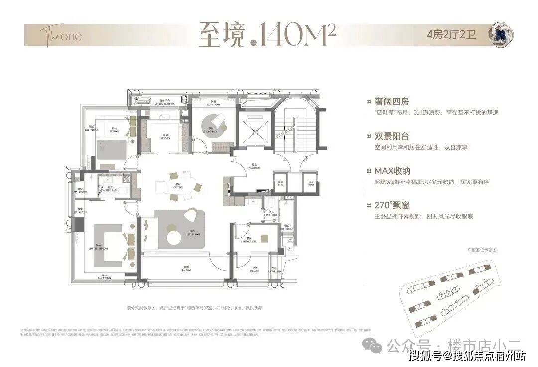 45-50㎡的超尺度客餐厅,四开间朝南,总面宽约14米。主卧套房配备了270°转角飘窗,独立卫浴包含双台盆与浴缸。
