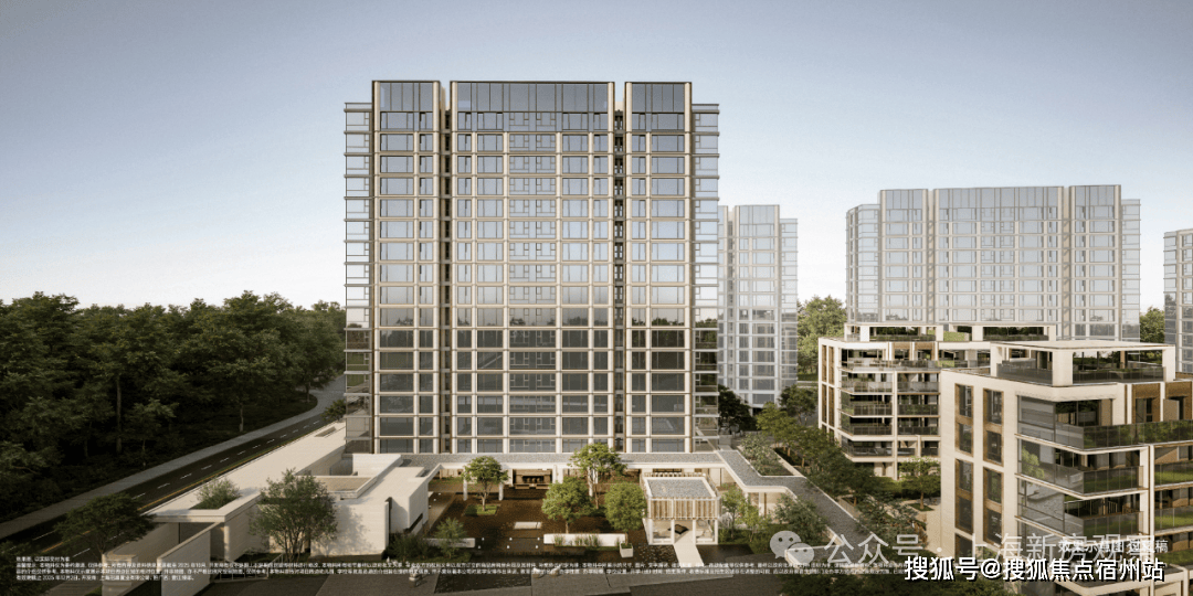 建筑立面上,项目萃取希腊柱式秩序感,以古铜色铝板、超大玻璃幕墙与灵动弧线的高端组合,窗墙比最大达0.35,呈现出温润典雅的质感。同时,秉持“揉石成缎”的审美理念,以温润隽永的弧度造型呼应海派河流意向,打造项目温润雅奢的气质美学,呼应在文化下长成的高端客群。
