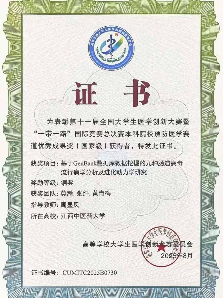 1.荣获2025年8月第十一届全国大学生医学创新大赛暨“一带一路”国际竞赛总决赛预防医学赛道国家级铜奖2025年国家级大学生创新训练计划立项