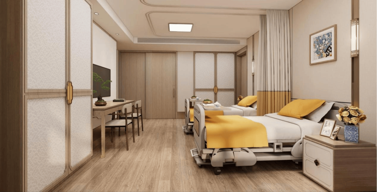 项目分三期建设,循序渐进打造完善的康养配套。一期工程涵盖二级综合医院——京北医院、护理中心和颐养公寓,其中护理中心位于京北医院9至13层,设置VIP豪华间、单人间、双人间和三人间,床位共计200余张,可专业接收失能、半失能长者。所有房间均为精装修,内部配备氧气、负压、紧急呼叫和电动护理床等专业养老设备,每层还设有公共活动区域、休闲区、助浴室和洗衣房,全方位满足长者的日常生活与休闲需求。颐养公寓则规划有724套居室,1500张床位,涵盖一至三居室多种户型,均为精装修交付,配备SOS紧急呼叫系统,满足活力长者的休闲养生、旅居或长期康养需求。同时,一期还配套建设老年大学、营养餐厅、温泉会所等,丰富长者的精神文化生活与日常生活便利。