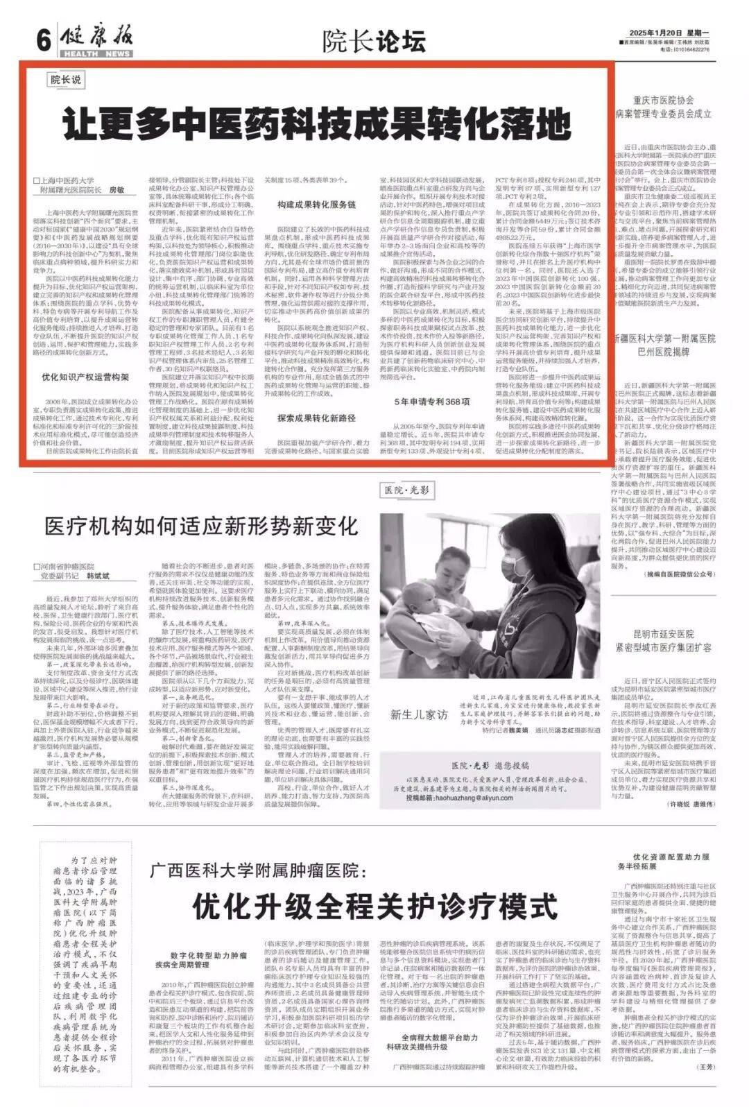 2025年1月20日,健康报6版“院长论坛”栏目以《院长说让更多中医药科技成果转化落地》为题刊发署名文章,从制度机制、人才队伍、合作路径等不同侧面,系统呈现我院在中医药科技成果转化领域的探索与成效。