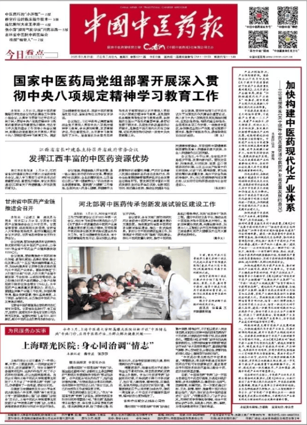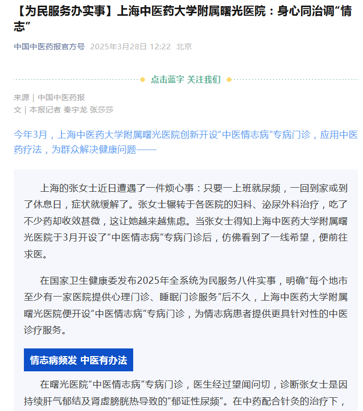 2025年3月,中国中医药报以《上海中医药大学附属曙光医院:身心同治调 “情志”》为题,深度聚焦我院创新开设的 “中医情志病” 专病门诊,全方位呈现医院践行为民服务办实事、以中医药特色疗法守护群众情志健康的实践成效。