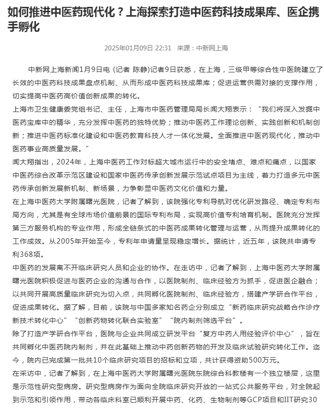 2025年1月9日,中新网以《如何推进中医药现代化?上海探索打造中医药科技成果库、医企携手孵化》为题,深度报道了我院在建立中医药科技成果盘点机制、构建科技成果库、共建产学研平台等方面的创新实践。