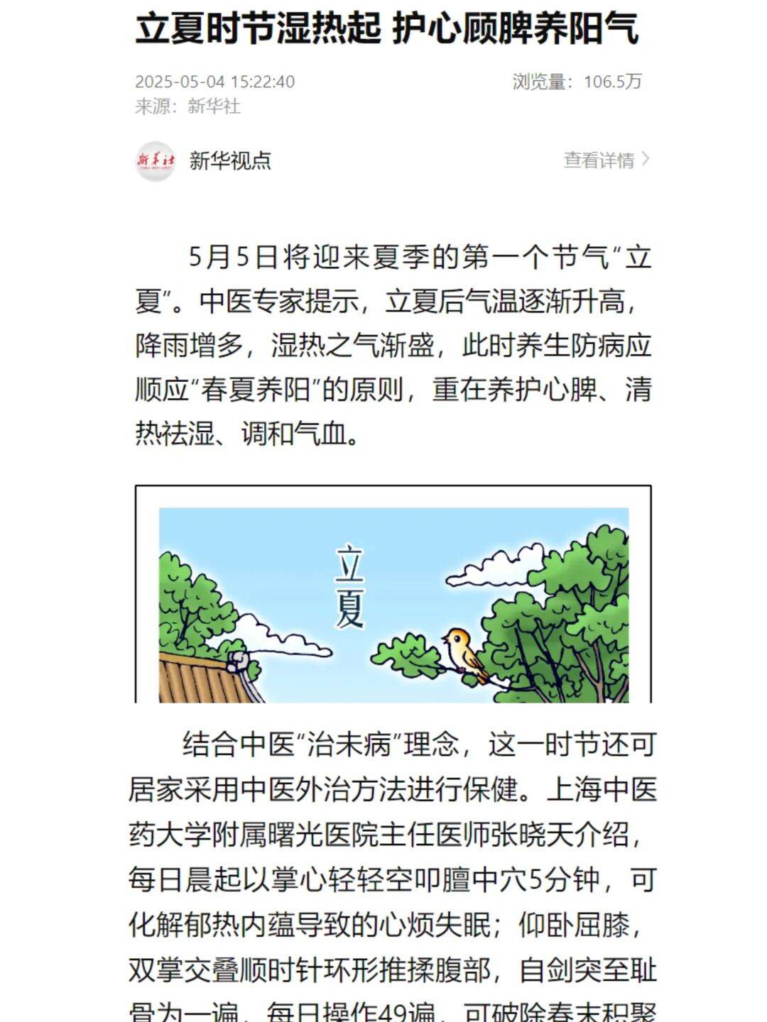 2025年4月19日、5月4日,新华社先后刊发《谷雨时节湿气增 柔肝健脾正当时》《立夏时节湿热起 护心顾脾养阳气》两篇报道,介绍我院治未病科主任张晓天主任医师的节气养生科普。