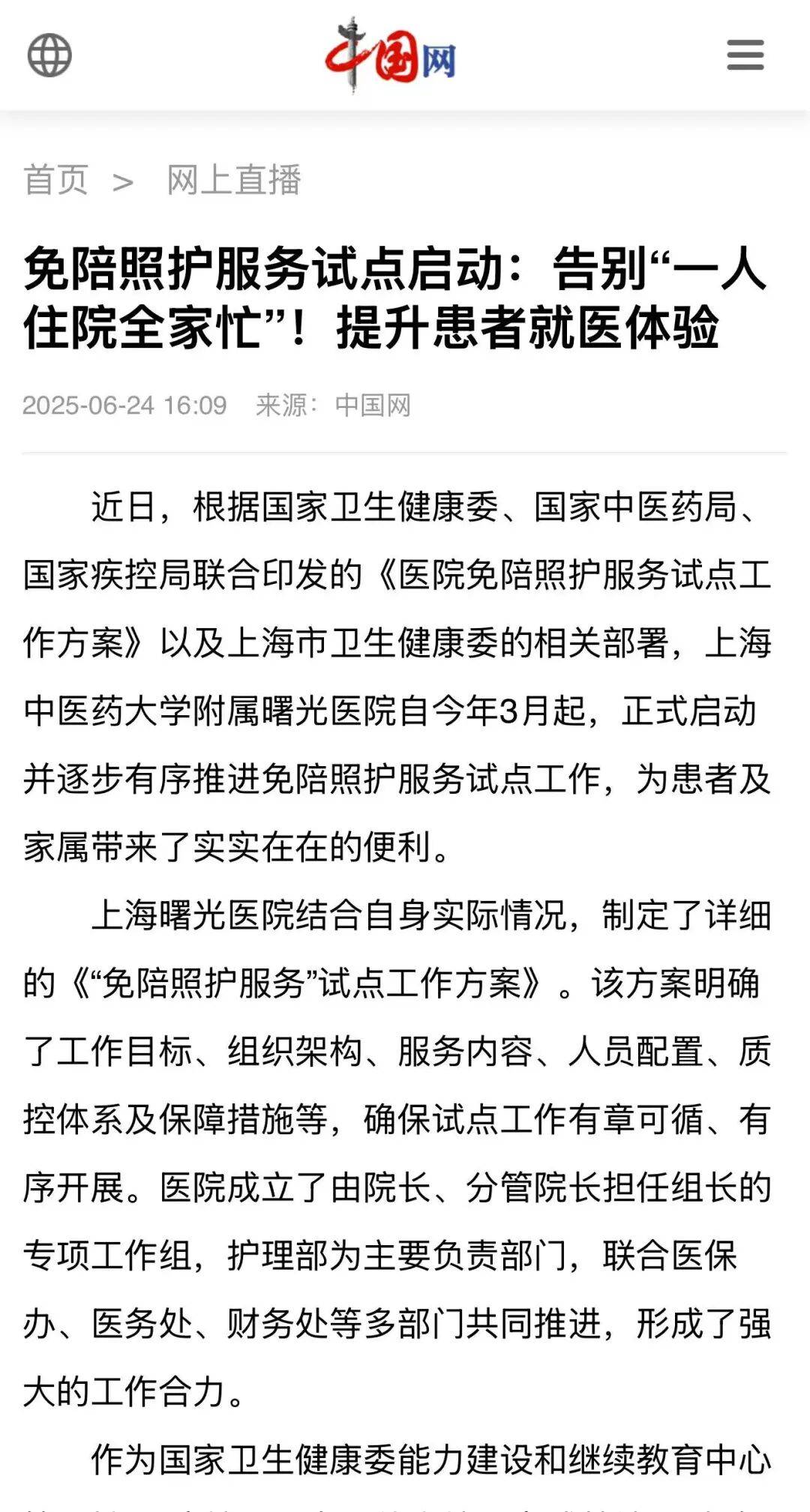 2025年6月24日,中国网以《免陪照护服务试点启动:告别“一人住院全家忙”!提升患者就医体验》为题,聚焦我院作为国家卫生健康委“医疗护理员专项能力培训实践基地”,率先启动并有序推进免陪照护服务试点工作的创新实践。