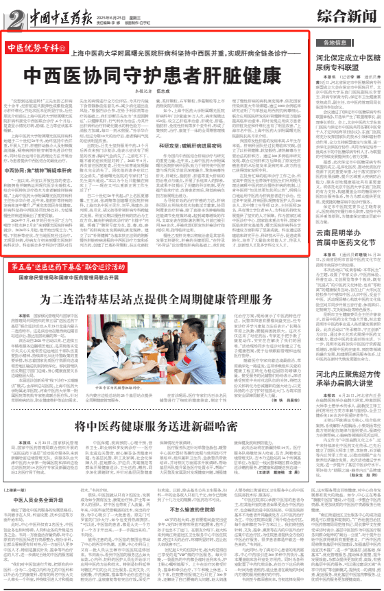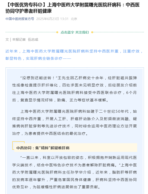 2025年6月23日,中国中医药报以《上海中医药大学附属曙光医院肝病科:中西医协同守护患者肝脏健康》为题,深度聚焦我院肝病科作为国家区域中医诊疗中心、国家临床重点专科的建设成效,全方面呈现科室自二十世纪50年代赓续至今的学科底蕴。