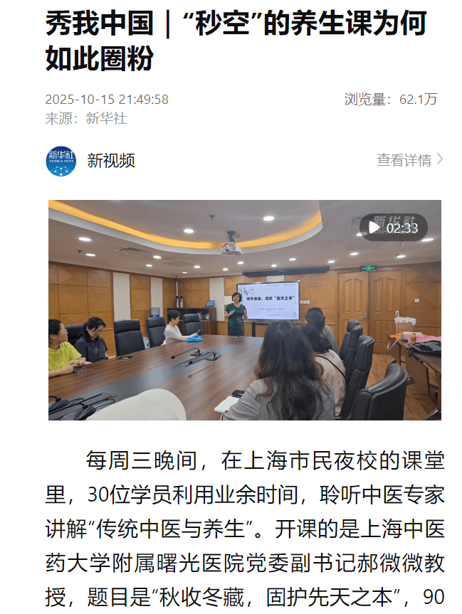 2025年10月,新华社《秀我中国》栏目用镜头记录我院市民夜校课堂中医专家授课的鲜活场景。一门上线即“秒空”的养生课,在全市1200余门课程中热度跻身前五。“养生课”为何如此圈粉?记者走进90分钟课堂,在阵阵笑声中带大家寻找答案。