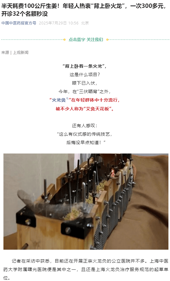 2025年7月29日,中国中医药报以《半天耗费100公斤生姜!年轻人热衷“背上卧火龙”,一次300多元,开诊32个名额秒没》为题,报道了我院开展冬病夏治“火龙灸”的相关情况。