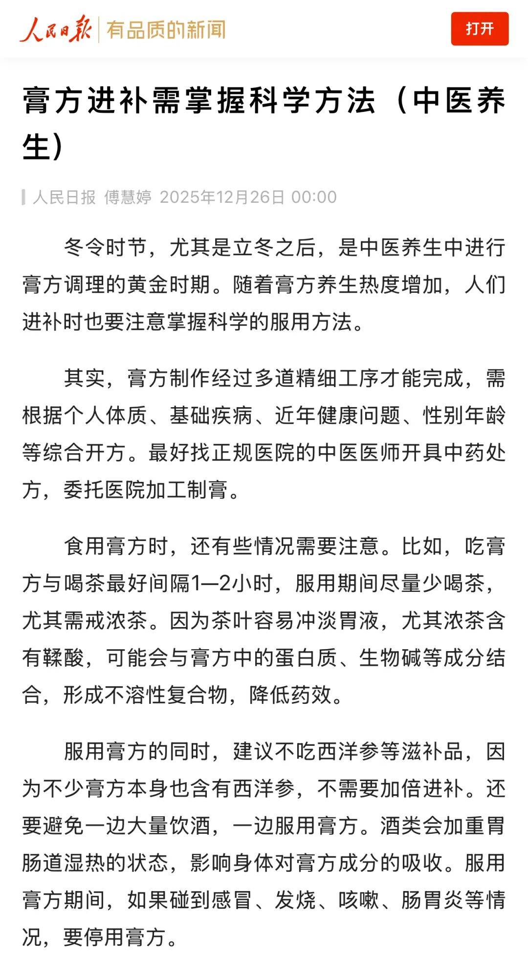 2025年12月,《人民日报》以《膏方进补需掌握科学方法》为题,刊发我院传统医学科主任医师傅慧婷署名文章,系统梳理冬令进补的关键环节与常见误区,为市民科学服用膏方提供科学指导。