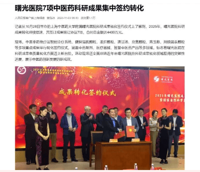 2025年,我院科研成果转化持续提速,共签订成果转让协议7项。11月,人民日报健康客户端等媒体报道了我院中医药科研成果转化的相关情况。