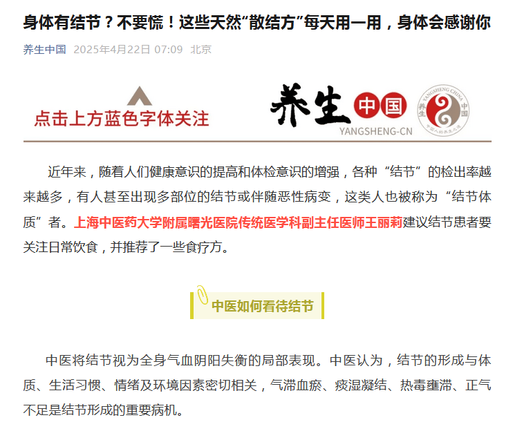 2025年,《养生中国》微信公众号报道了我院传统医学科副主任医师王丽莉关于结节防治的科普建议。王医生从中医角度分析了结节的成因与易感人群,并推荐了几款日常可用的食疗“散结方”,帮助大家在饮食调理中温和养护身体。
