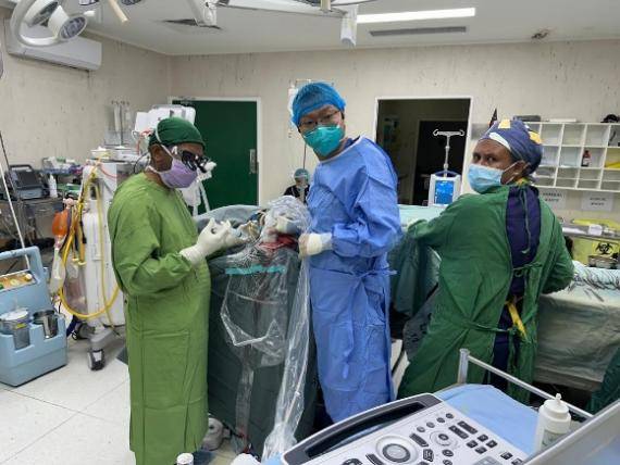 在技术攻坚方面,医疗队专家精准发力,成功开展多项“巴新首例”手术与技术应用。神经外科专家王世强创新采用术中超声引导联合显微镜技术,成功实施该国首例下丘脑肿瘤切除术,以毫米级精度突破“手术禁区”;心内科专家张晓良首次引入国际领先的“腋静脉穿刺”入路与“右室间隔部起搏”技术,推动当地起搏器植入从“能起搏”向“好起搏”跨越;泌尿外科专家张腾主导完成该国首例超声引导下前列腺穿刺活检术,扭转了前列腺癌“诊断靠推测”的局面,开启了精准诊疗新阶段;新生儿科医生程晨创新运用高频振荡通气联合肺复张技术,在核心药物紧缺情况下成功救治危重早产儿,并同步填补了床旁头颅超声筛查、脐静脉置管等多项技术空白;中医师谭彪将针灸疗法引入卒中康复临床,帮助多位肢体功能障碍患者恢复行动能力,填补了当地中医康复领域的空白;口腔颌面外科医生邓江到岗次日即主刀完成复杂颈部淋巴及口腔肿瘤整块切除术,以精湛医术赢得当地同行的高度赞誉。